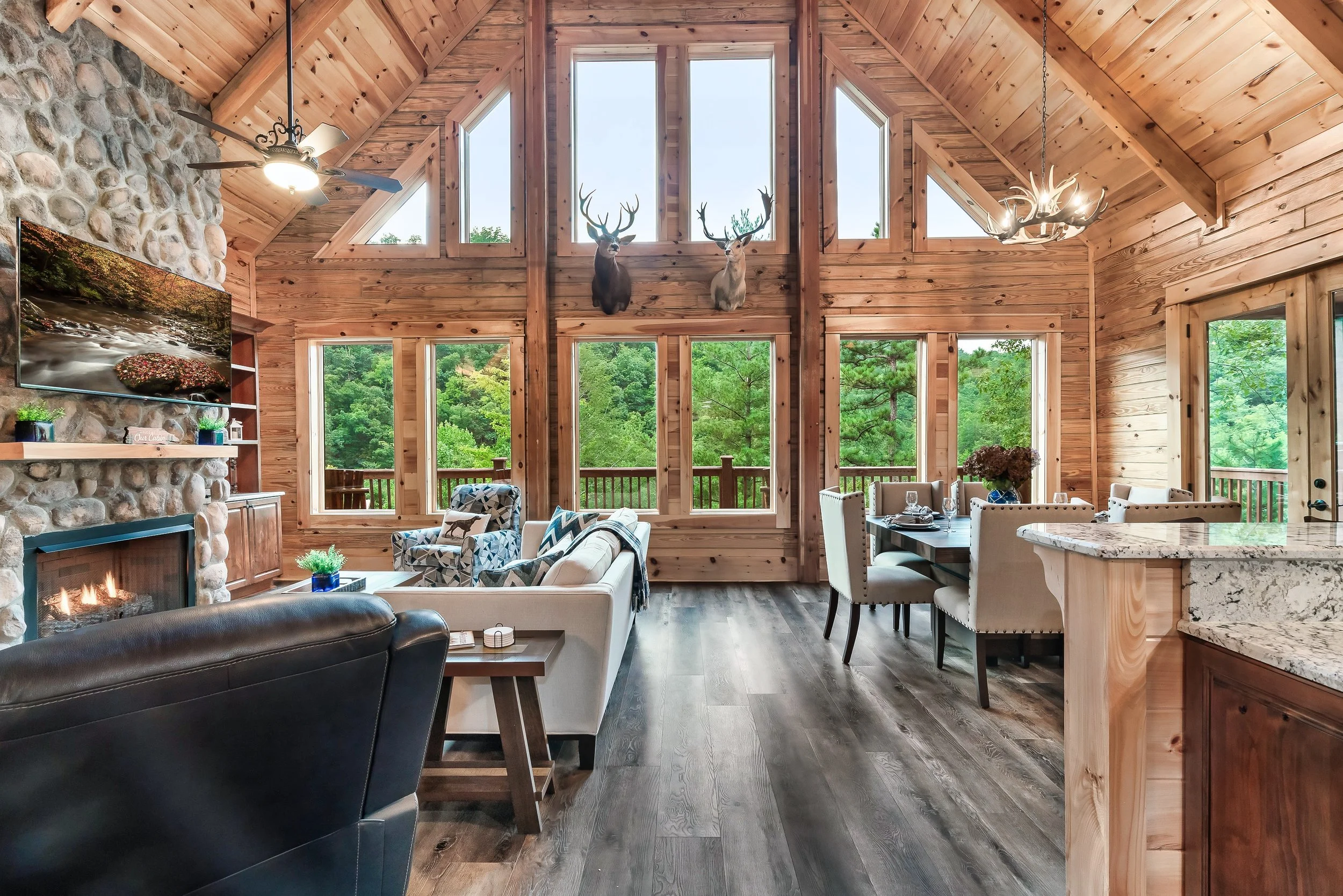 Open and inviting living area with seamless integration of modern luxury and rustic elements including a cozy fireplace, perfect for chilly mountain evenings and large windows framing stunning views of the surrounding mountains.